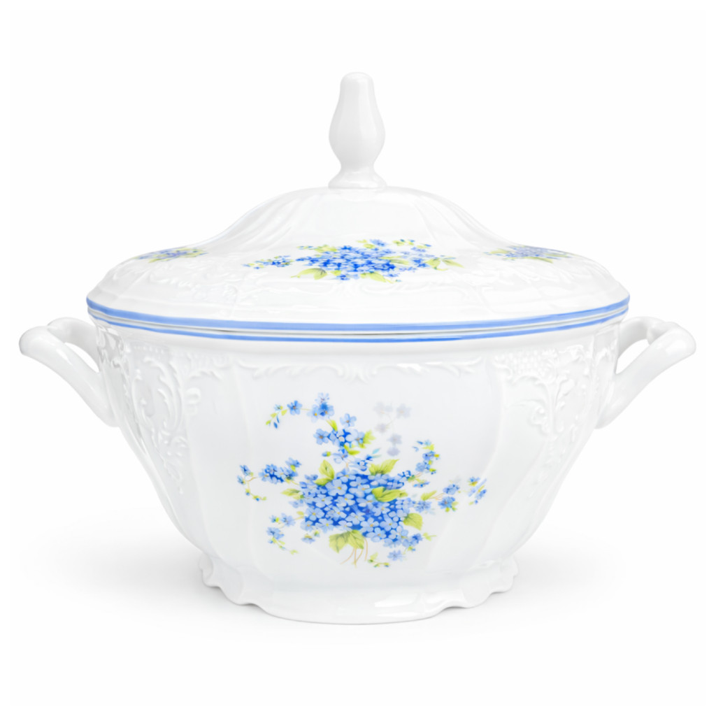 Porcelánová mísa na polévku "terina" BERNADOTTE pomněnka. Poklice obsahuje výřez na naběračku.