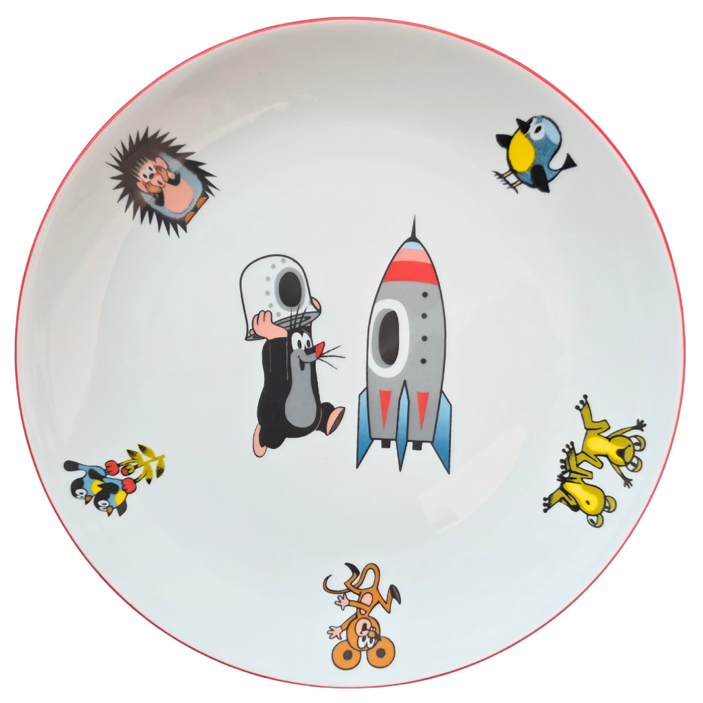 Porcelánový talíř mělký bílý KRTEČEK s raketou.