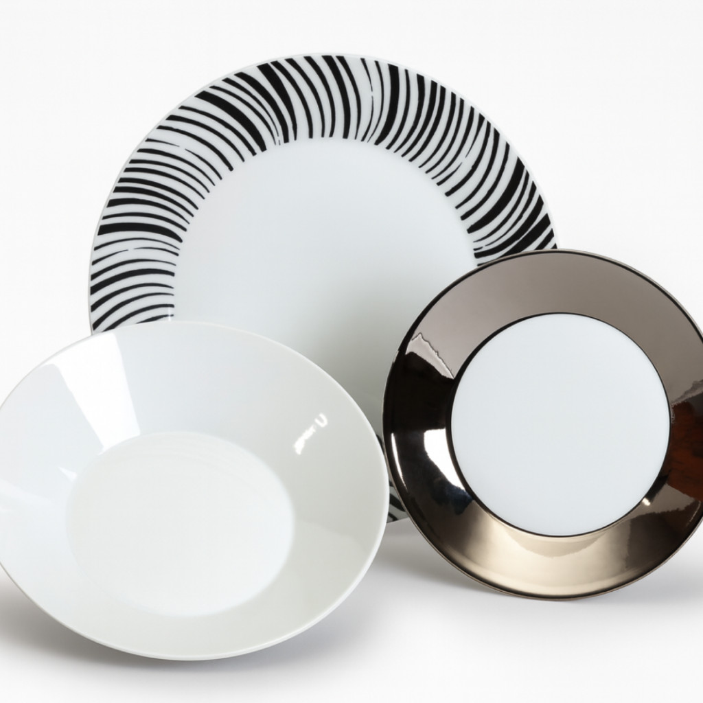 Porcelánová talířová souprava pokov TOM PRAPOR. Tato souprava vyniká originálním zdobením, které vzniká pomocí speciální technologie nanášení kovu. Spojení platiny a černého dekoru na bílém porcelánu působí luxusně a dodává celé kolekci elegantní a nevšední charakter. Tento servis ocení především milovníci netradičního a stylového stolování.