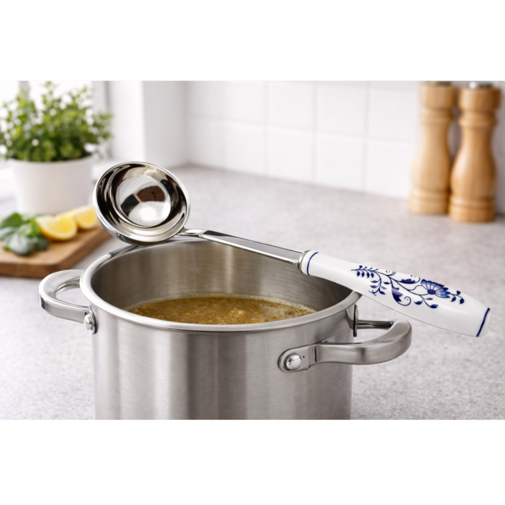 Naběračka na polévku CIBULÁK zaujme porcelánovou rukojetí s originálním dekorem a kvalitním zpracováním z nerezové oceli , mechanicky leštěné do vysokého lesku. Je ideální pro stylové servírování polévek, má objem 0,1 l a pro zachování dekoru doporučujeme ruční mytí.