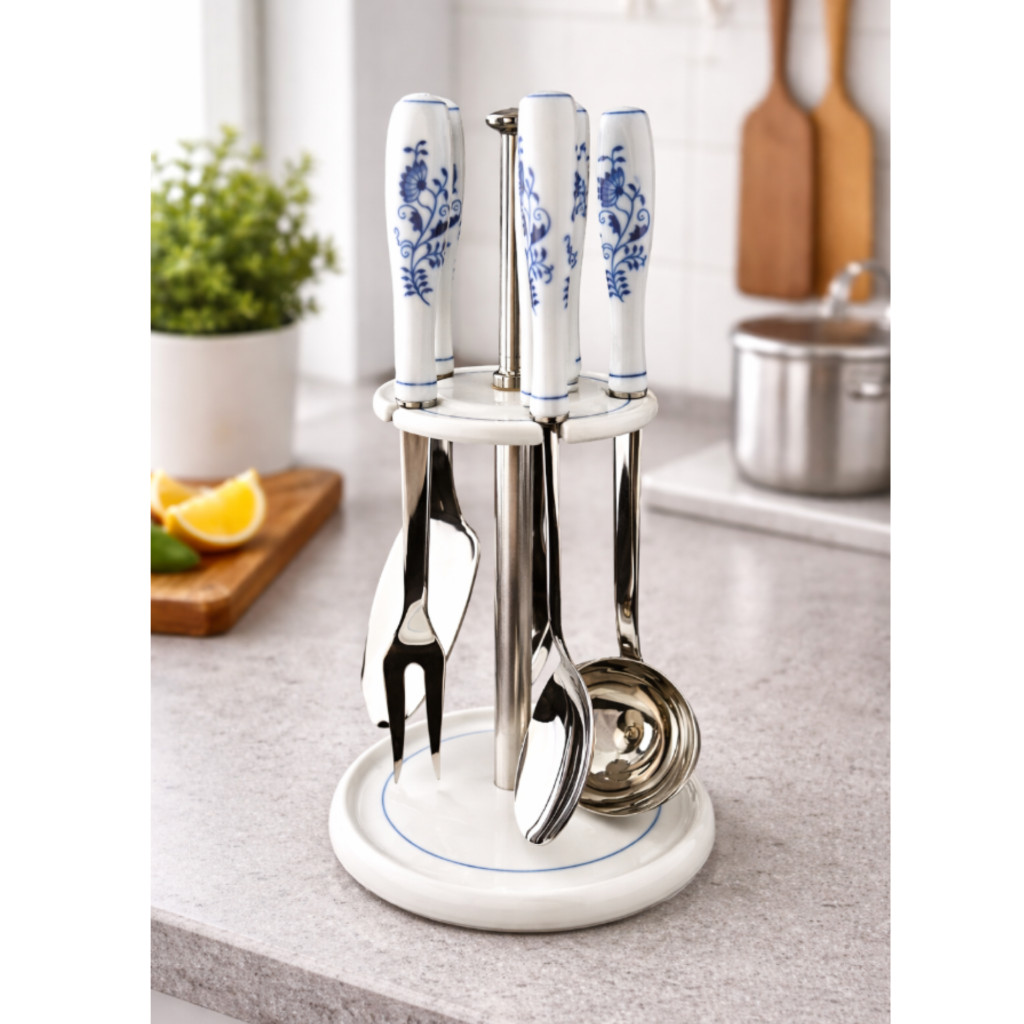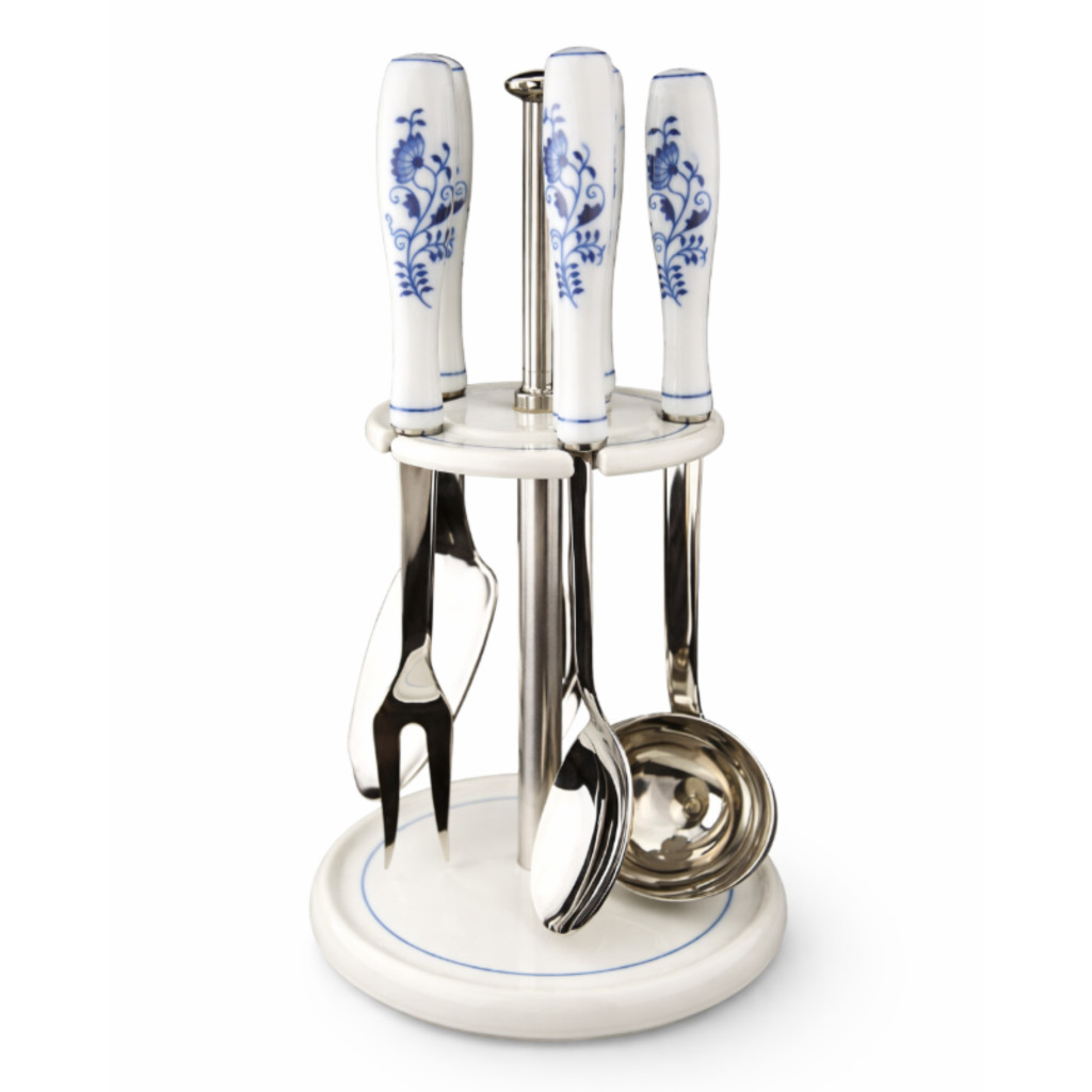 Závěsná 5dílná kuchyňská sada CIBULÁK – balení prestige kombinuje tradiční porcelánové rukojeti s originálním dekorem a kvalitní nerezovou ocel 18/10, mechanicky leštěnou do vysokého lesku.