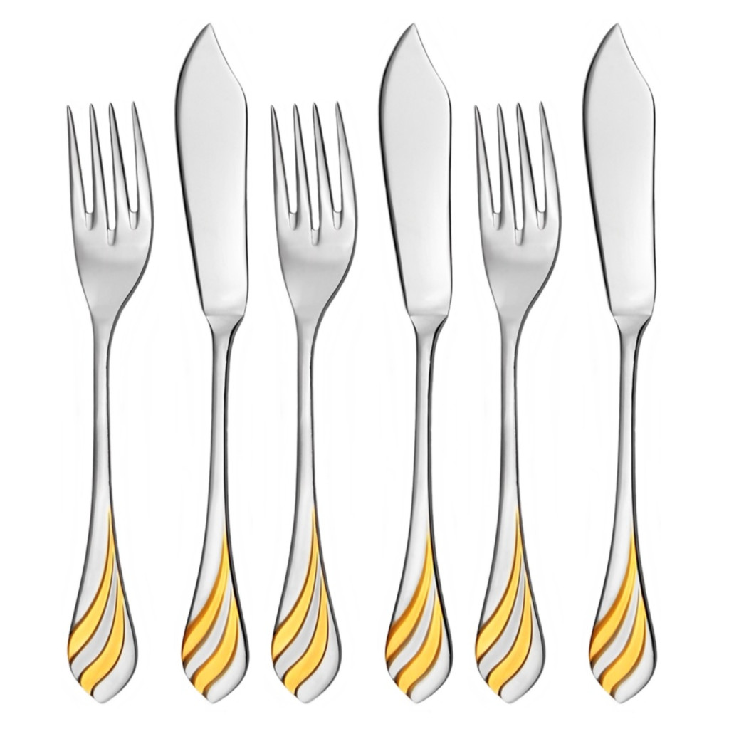 Příbor na ryby pozlacený MELODIE z kvalitní nerezové oceli vyniká dekorativním pozlacením, vysokým leskem a elegantním zpracováním pro slavnostní stolování. Šestidílná sada pro 3 osoby v dárkovém balení je ideálním dárkem k Vánocům, svatbě, jubileu i dalším výjimečným příležitostem.