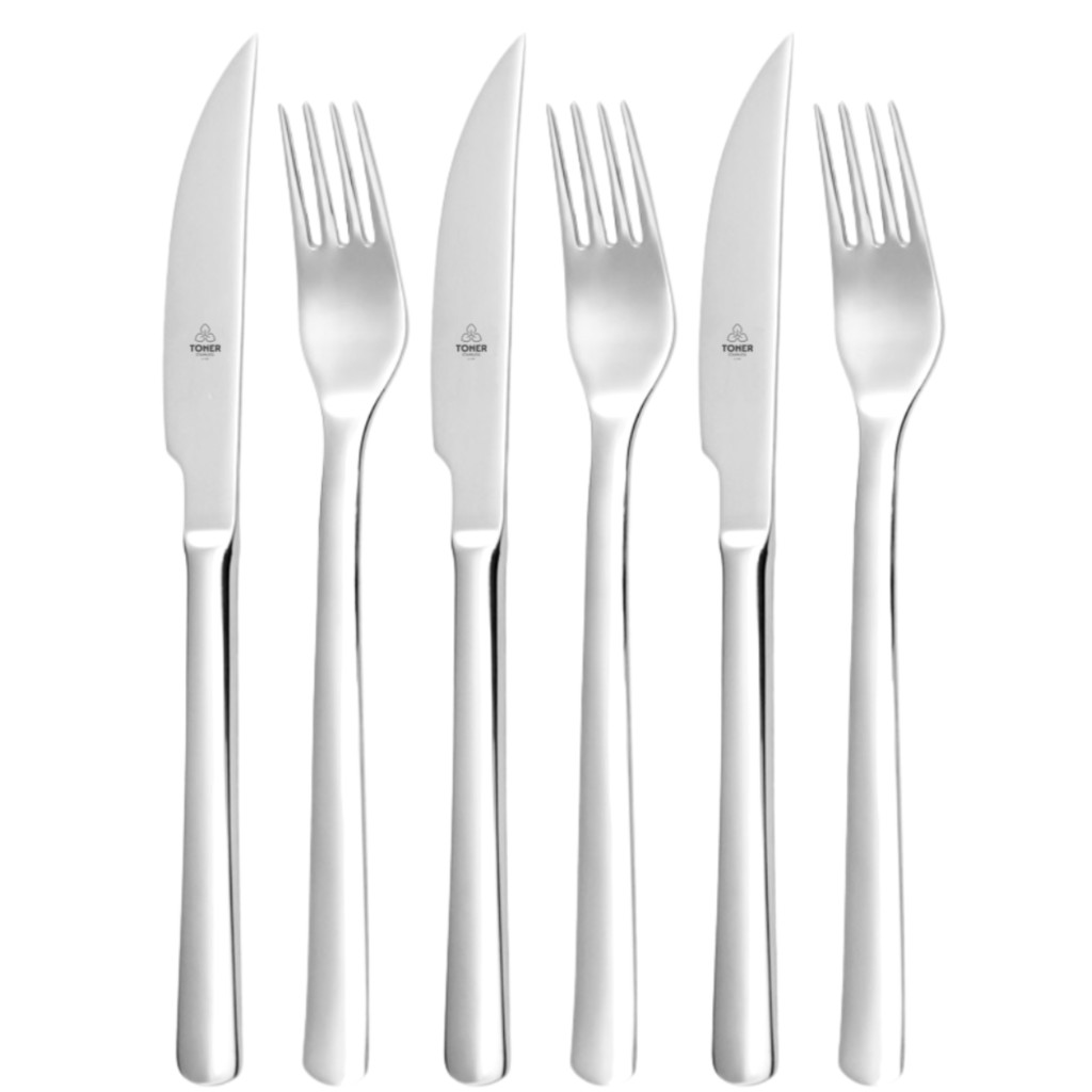 PROGRES 6dílná steaková sada pro 3 osoby z kvalitní nerezové oceli, mechanicky leštěné do vysokého lesku, která zajišťuje vysokou odolnost a elegantní vzhled.